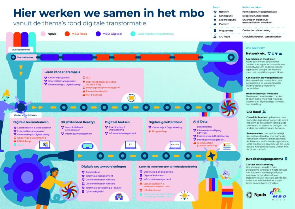 De praatplaat 'Hier werken we samen in het mbo vanuit de thema's rond digitalisering met Npuls staat online. Een handig overzicht van alle samenwerkingsverbanden op thema.