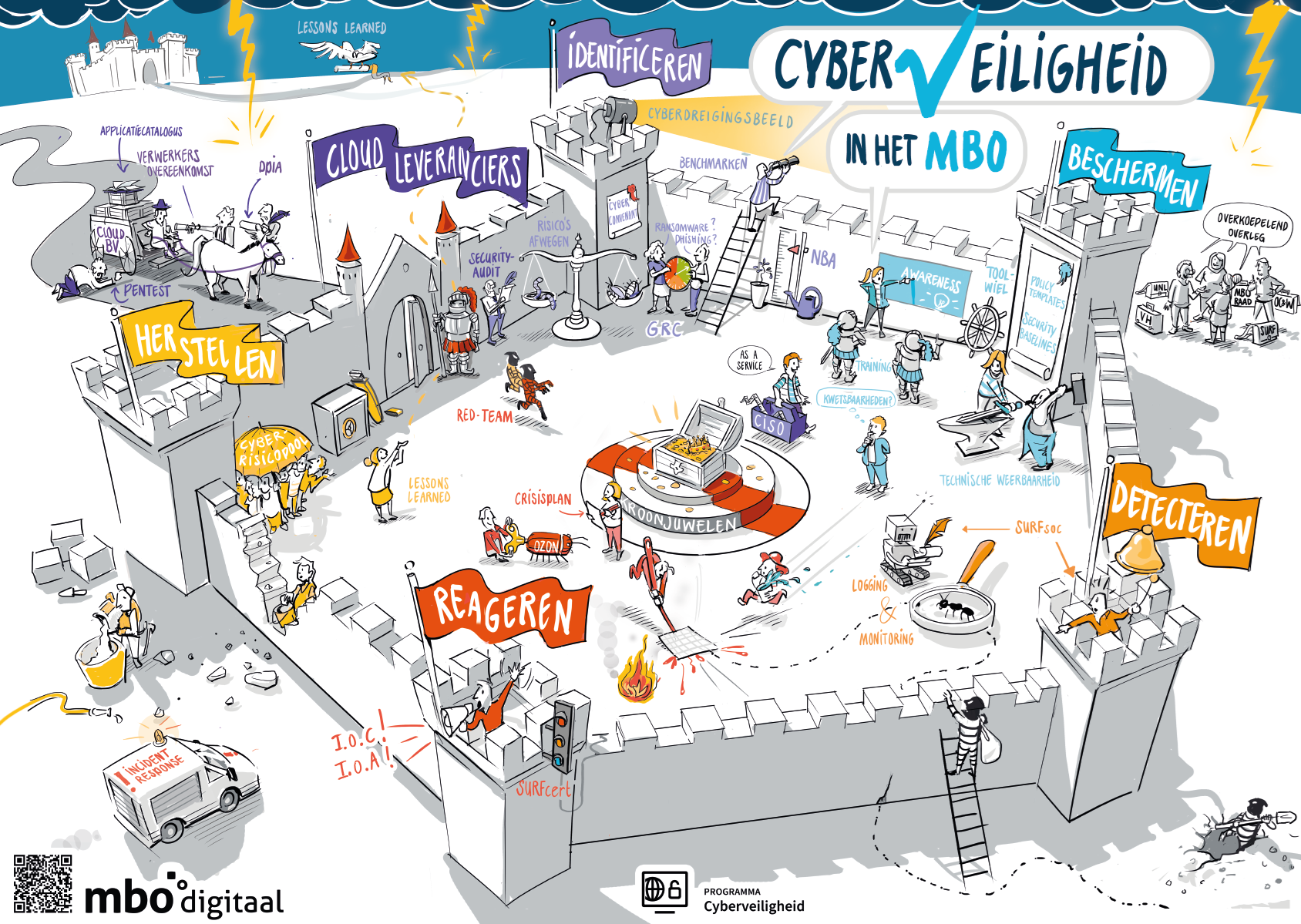 Met de praatplaat over cyberveiligheid voeren we op een laagdrempelige manier het gesprek over de activiteiten die we oppakken binnen het programma. De praatplaat doet het goed tijdens workshops en presentaties, maar ook hier online. Ontdek zelf wat we allemaal doen op het gebied van cyberveiligheid in het mbo! En klik vooral op de thumbnails onder de praatplaat voor informatie over de 6 thema's van het programma Cyberveiligheid.