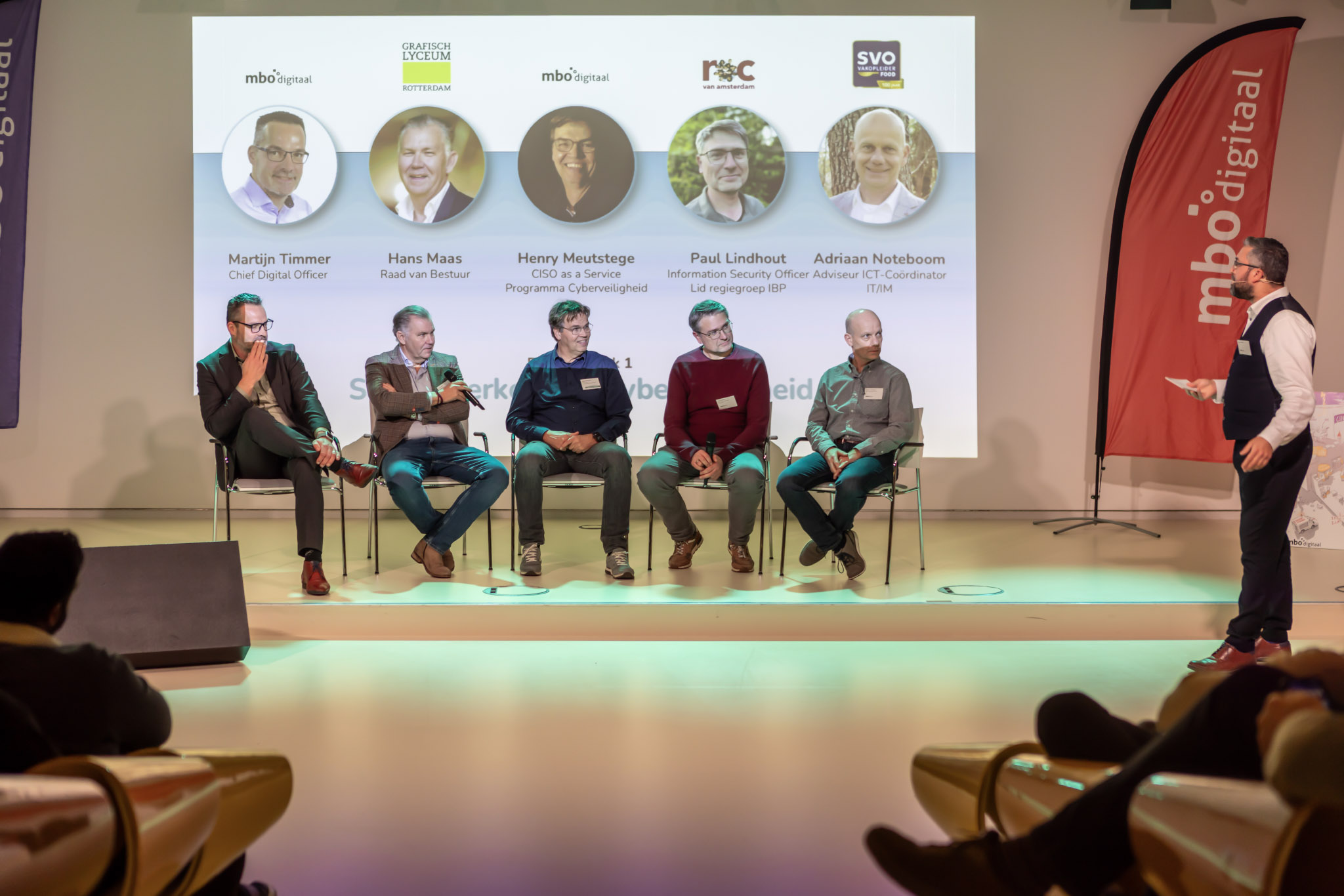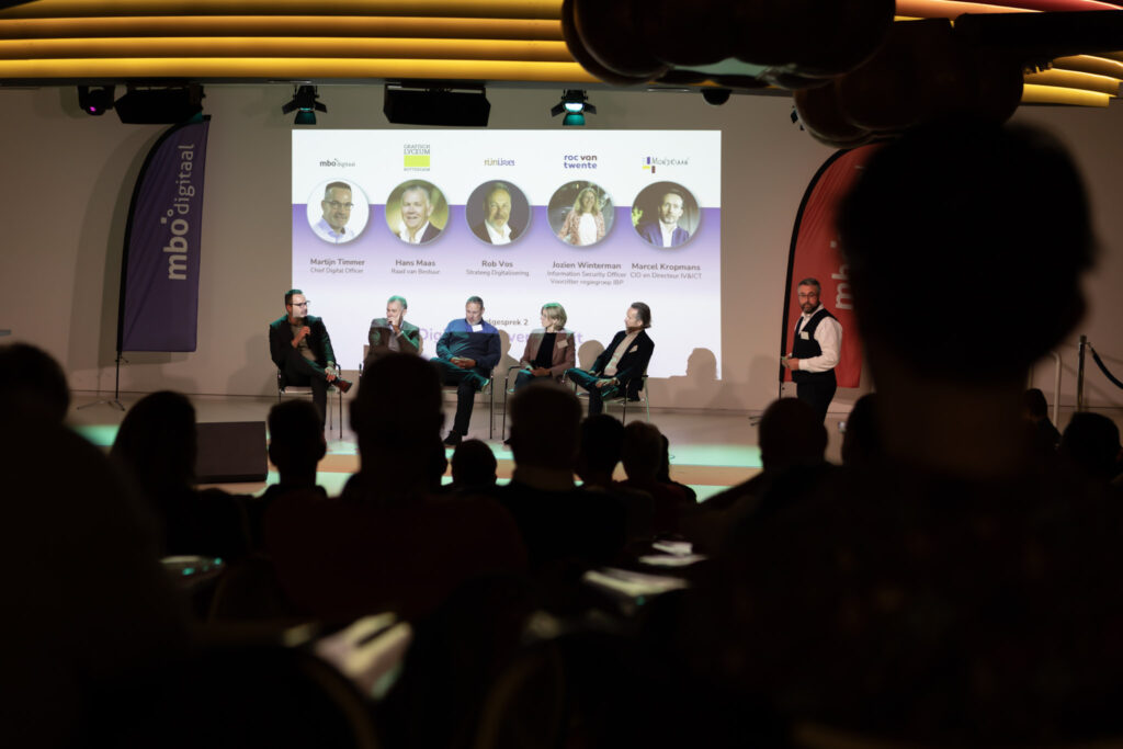 Hans Maas (Grafisch Lyceum Rotterdam), Henry Meutstege (programma Cyberveiligheid mbo), Adriaan Noteboom (SVO), Paul Lindhout (ROC van Amsterdam) en Martijn Timmer (MBO Digitaal) spraken over het doel dat de sector groeit naar volwassenheidsniveau 3.0 volgens het SURFaudit Toetsingskader.