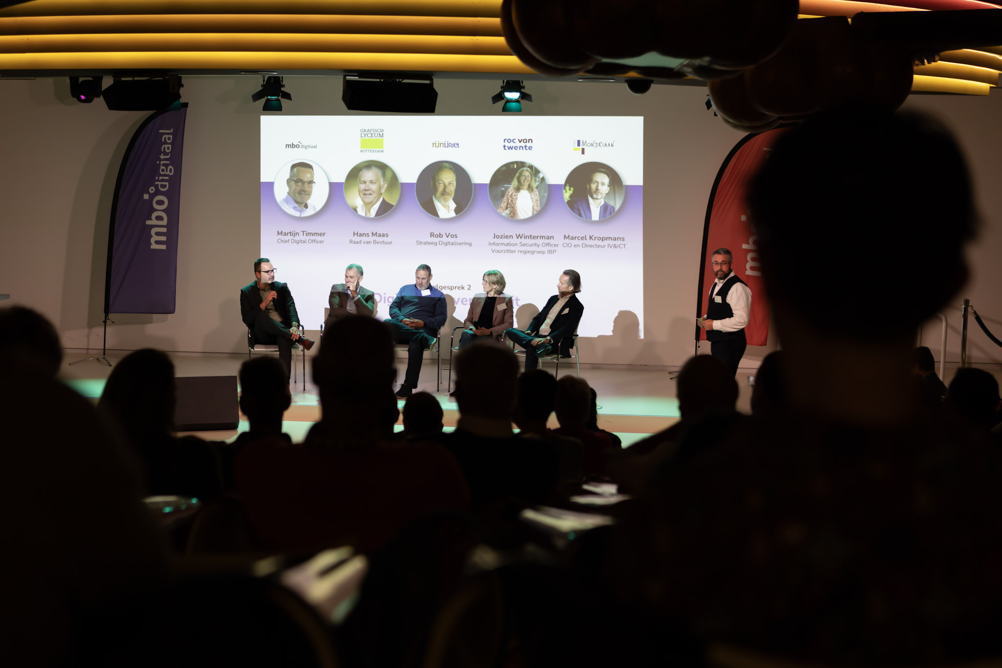 In de tweede sessie gaven Marcel Kropmans (ROC Mondriaan), Hans Maas (Grafisch Lyceum Rotterdam), Rob Vos (Rijn IJssel), Martijn Timmer (MBO Digitaal) en Jozien Winterman (ROC van Twente) hun kijk op het zeer actuele onderwerp digitale soevereiniteit.